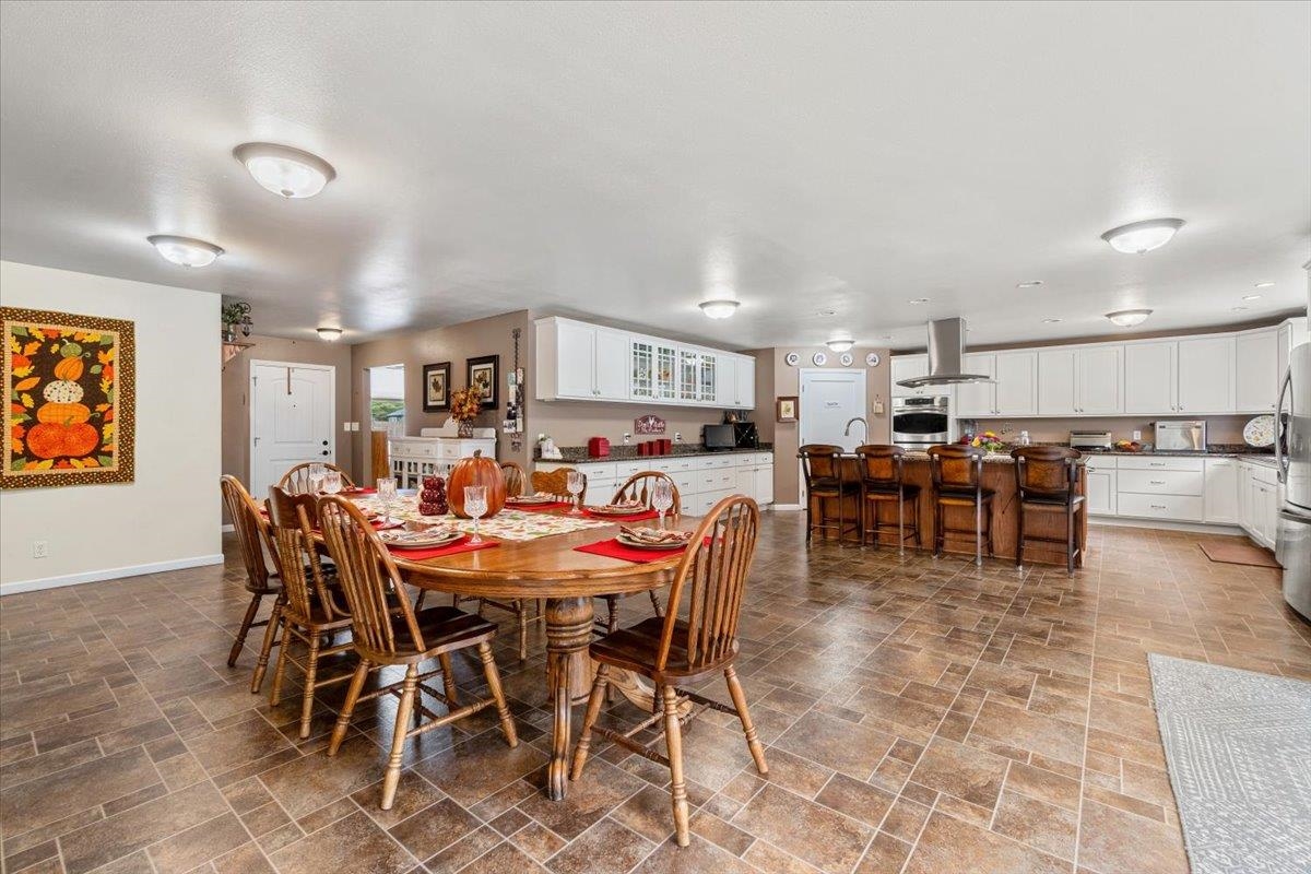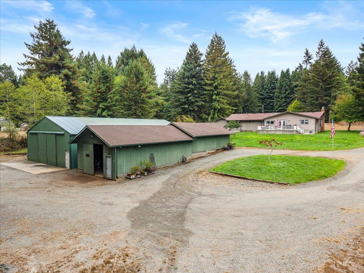 Welcome to 6251 Kings Valley Road, offering comfort, function, and space on 3.88 acres. This 4-bedroom, 2-bath single-level home is designed for gathering, entertaining, and everyday living in a desirable setting. At its center is the expansive kitchen—a true showpiece—with a large granite island, generous counter space, and an open flow into the dining and living areas. The dining room is remarkable in size, easily accommodating large groups and providing the perfect backdrop for holidays and celebrations. Together, this space is a showcase of warmth and function. A wood-burning stove in the family room adds charm and creates a cozy retreat. Outside, multiple large workshops provide space for storage, projects, or business use. The level acreage gives you room to spread out, while mature redwoods add natural beauty and shade to the property. With its blend of indoor comfort, usable acreage, and versatile workshops, 6251 Kings Valley Road offers a rare opportunity to enjoy rural living with the convenience of a well-maintained home.