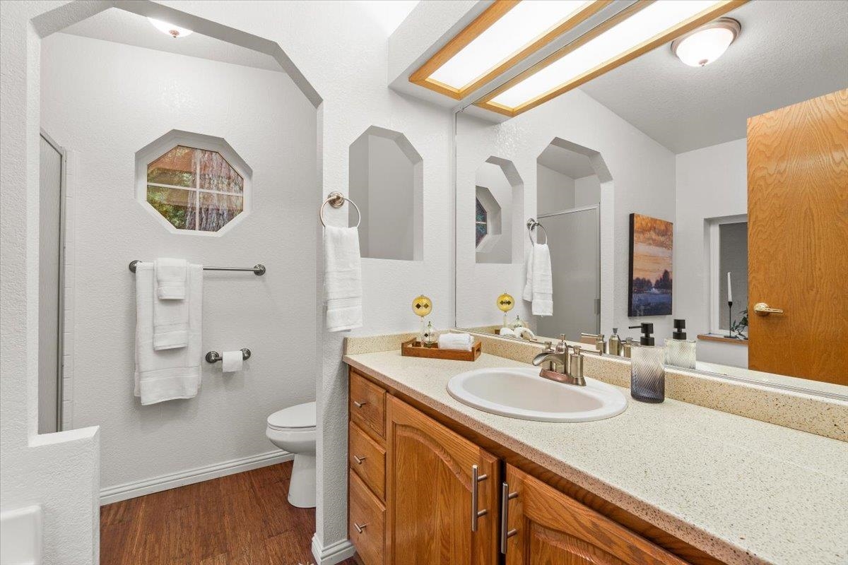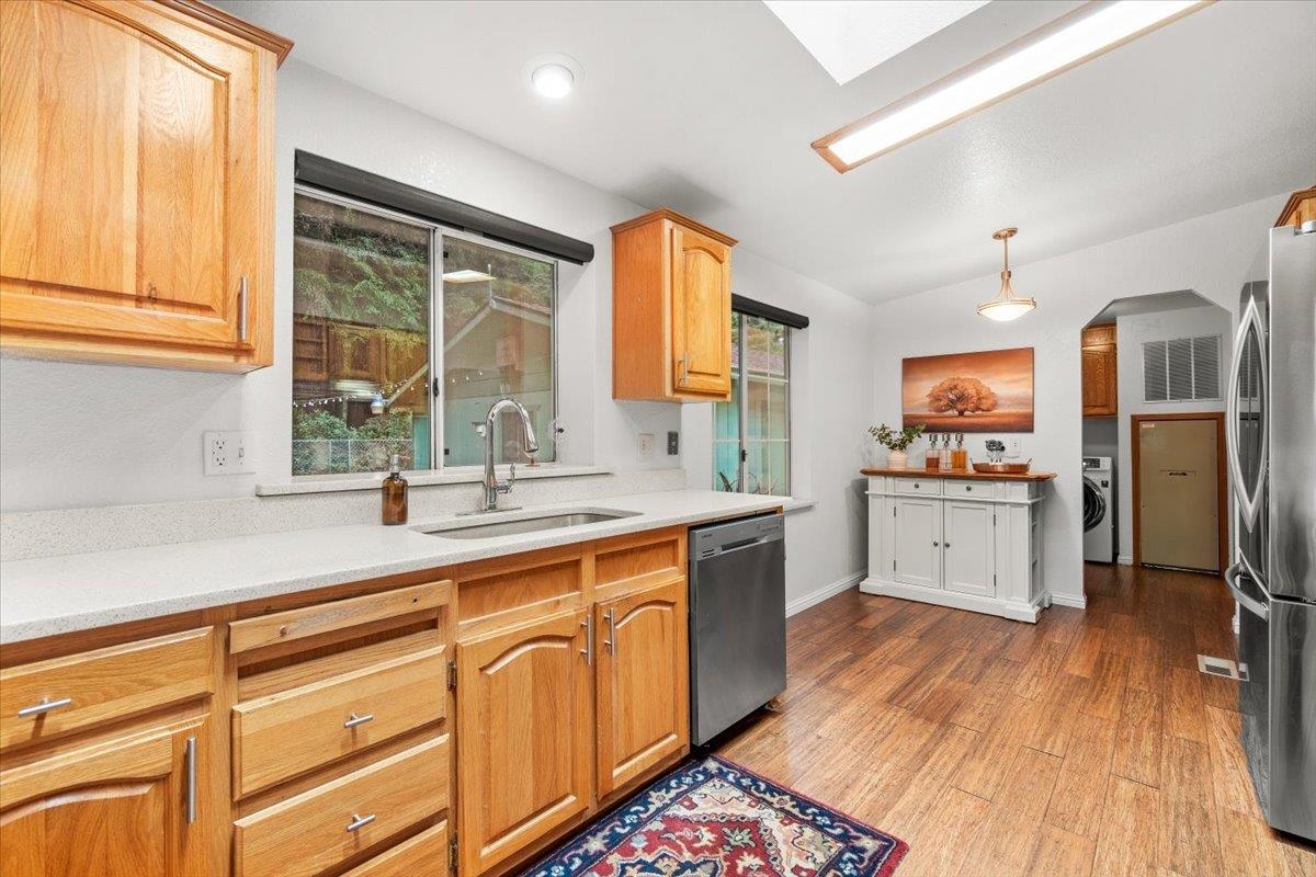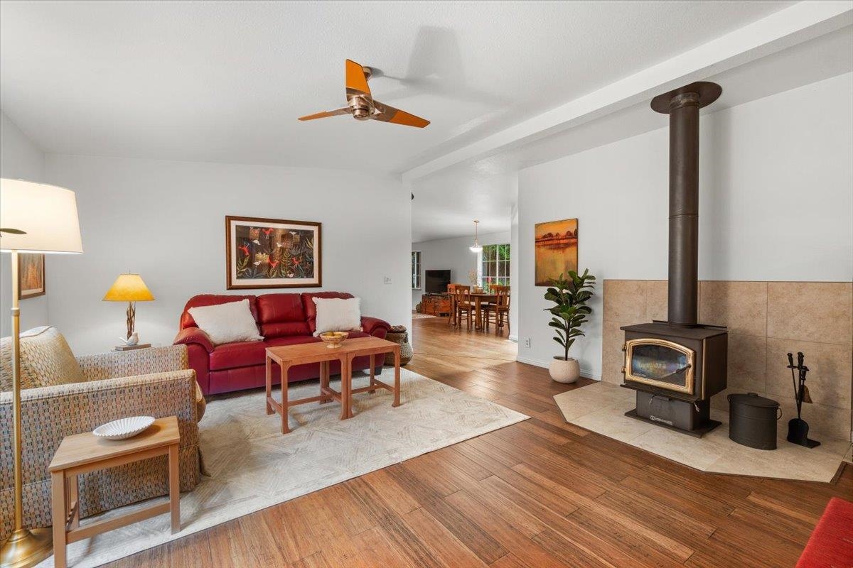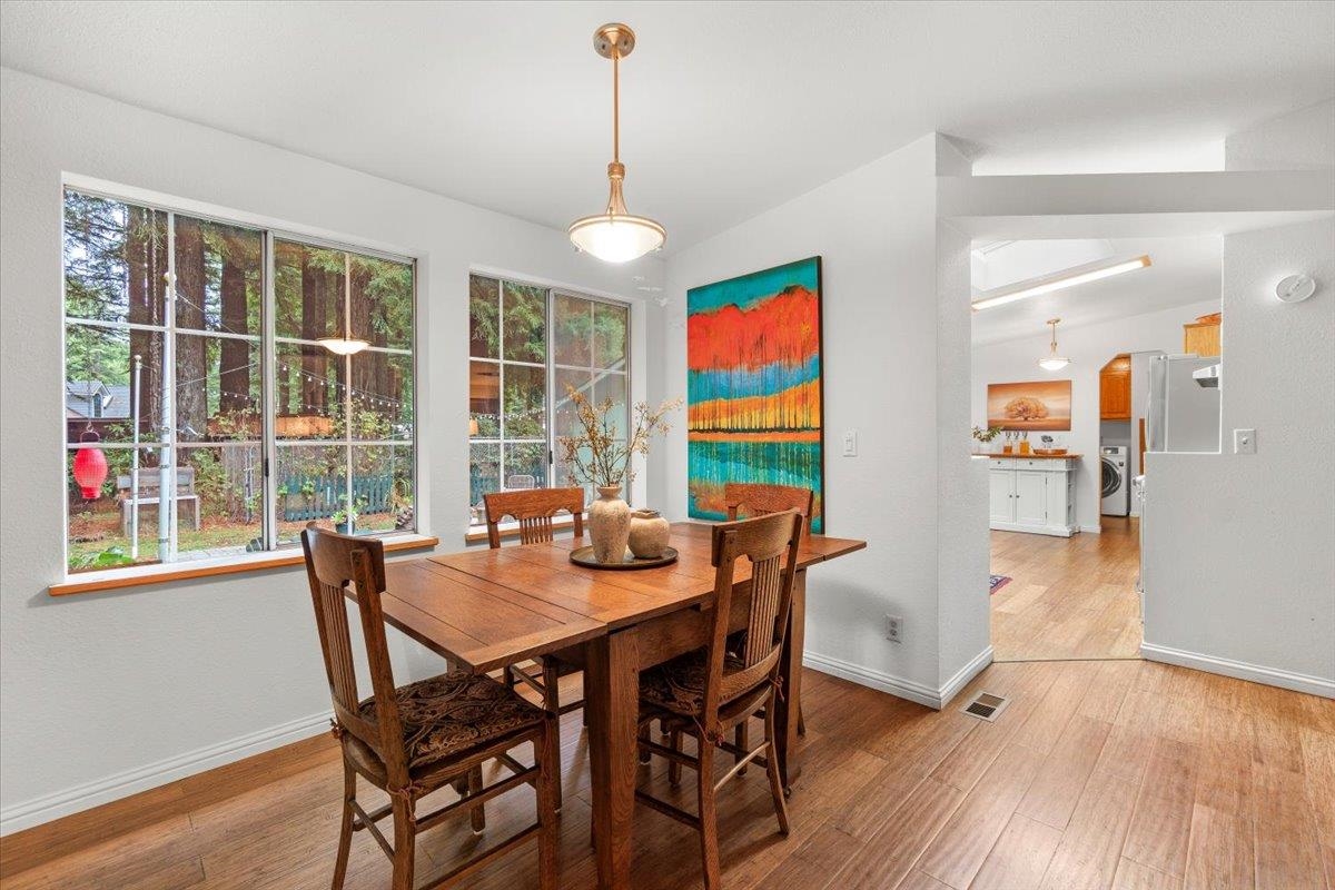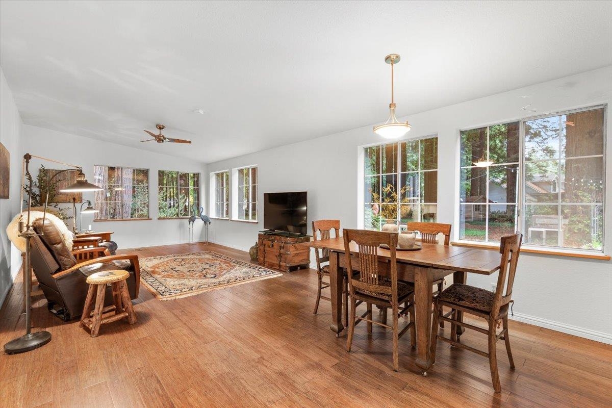 Welcome to 100 Devol Ct — A serene retreat tucked beneath towering redwoods on a peaceful cul-de-sac. The property sits on 1.07 picturesque acres, this beautiful 3 bedroom, 2 bath home offers privacy, nature, and spacious living just minutes from town and outdoor recreation. Step inside to a large open floor plan with a wood stove in the living room to add extra coziness with abundant natural light and views of the surrounding forest. The generous great room with large picture windows looking out onto the redwood grove flows seamlessly into the dining space and kitchen, creating a warm and inviting space for gatherings. A covered front porch provides the perfect place to relax while taking in the quiet beauty of the redwoods. The primary bedroom includes an en-suite with a large garden tub and walk-in closet. Two additional well-sized bedrooms offer flexibility for family, guests, or office space. Plenty of room to expand, garden, or build your dream outdoor entertaining area.