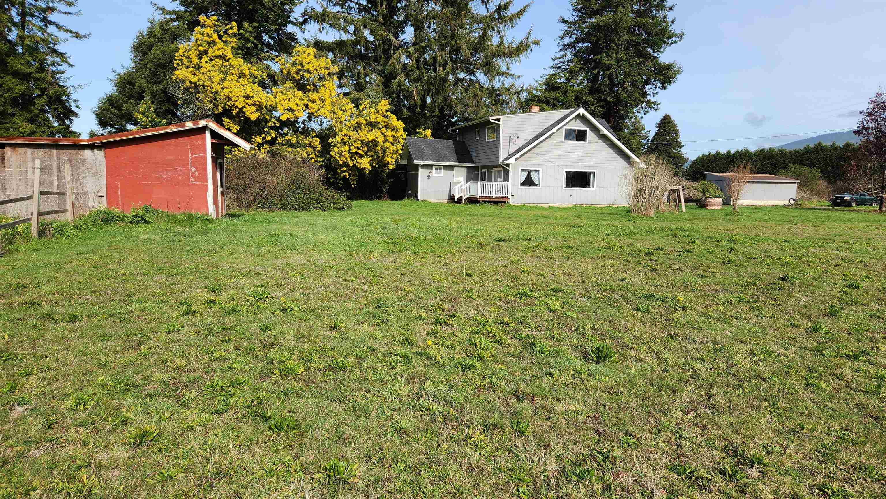 Country living awaits in this charming six bedroom three bath home. Sitting on 2.3 acres of level land perfect for gardening and animals. With a newer roof and well pump. For sale in its present condition. The east West exposure provides a cheerful sunlight atmosphere. The downstairs includes a pressure treated deck off of the dining and utility rooms. The large utility/mudroom has pantry storage and an updated full bathroom. Leave your muddy boots behind before heading into the attached kitchen. The primary suite is also downstairs with original framed wood floors and an ensuite including a large updated walk in shower. Upstairs there is a full bath with a walk-in shower and five bedrooms each with views of neighboring farms, trees and horses. The small barn includes a chicken coop with an app controlled chicken door, external nesting/ egg access and Dutch door entrance. This property is situated near a pumpkin patch, next to an organic farm with stand and minutes from an organic Dairy. Within a few miles of the Pacific Ocean, redwood groves and the renowned Smith River you'll never want to be far from home